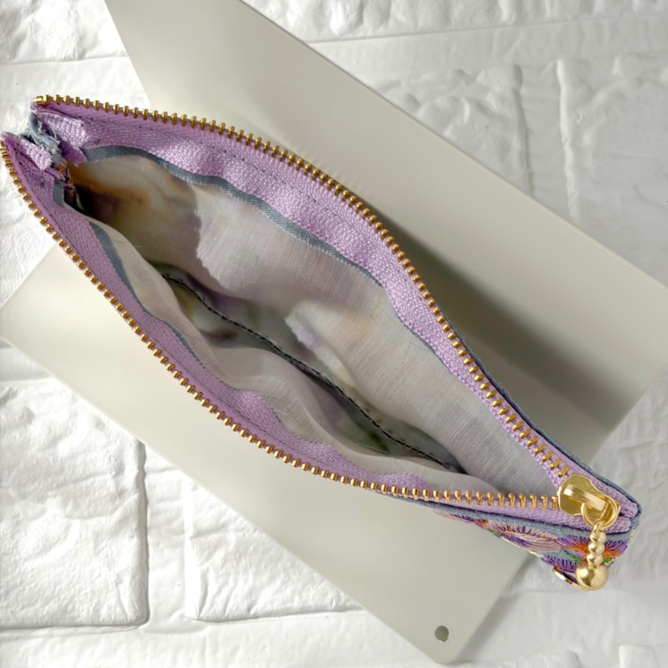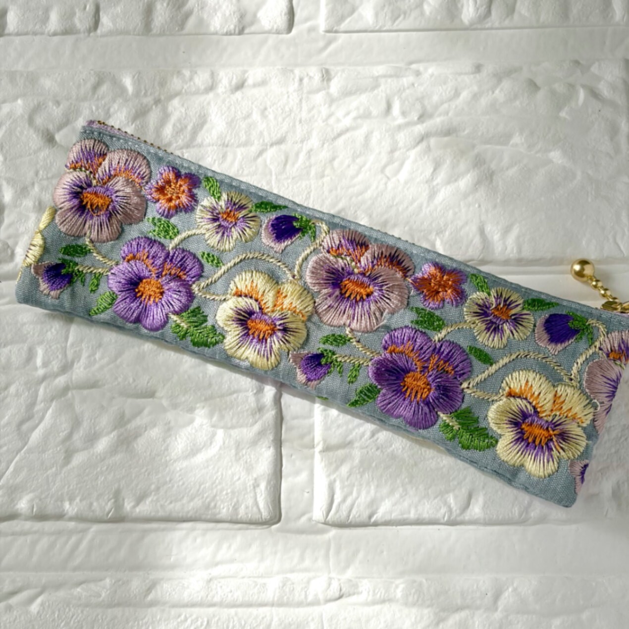 しっかりとした布地に、美しい刺繍が施されたインド刺繍リボンを使用したポーチです。