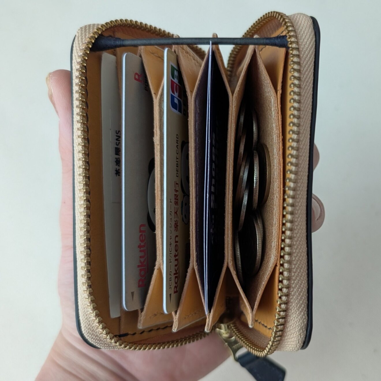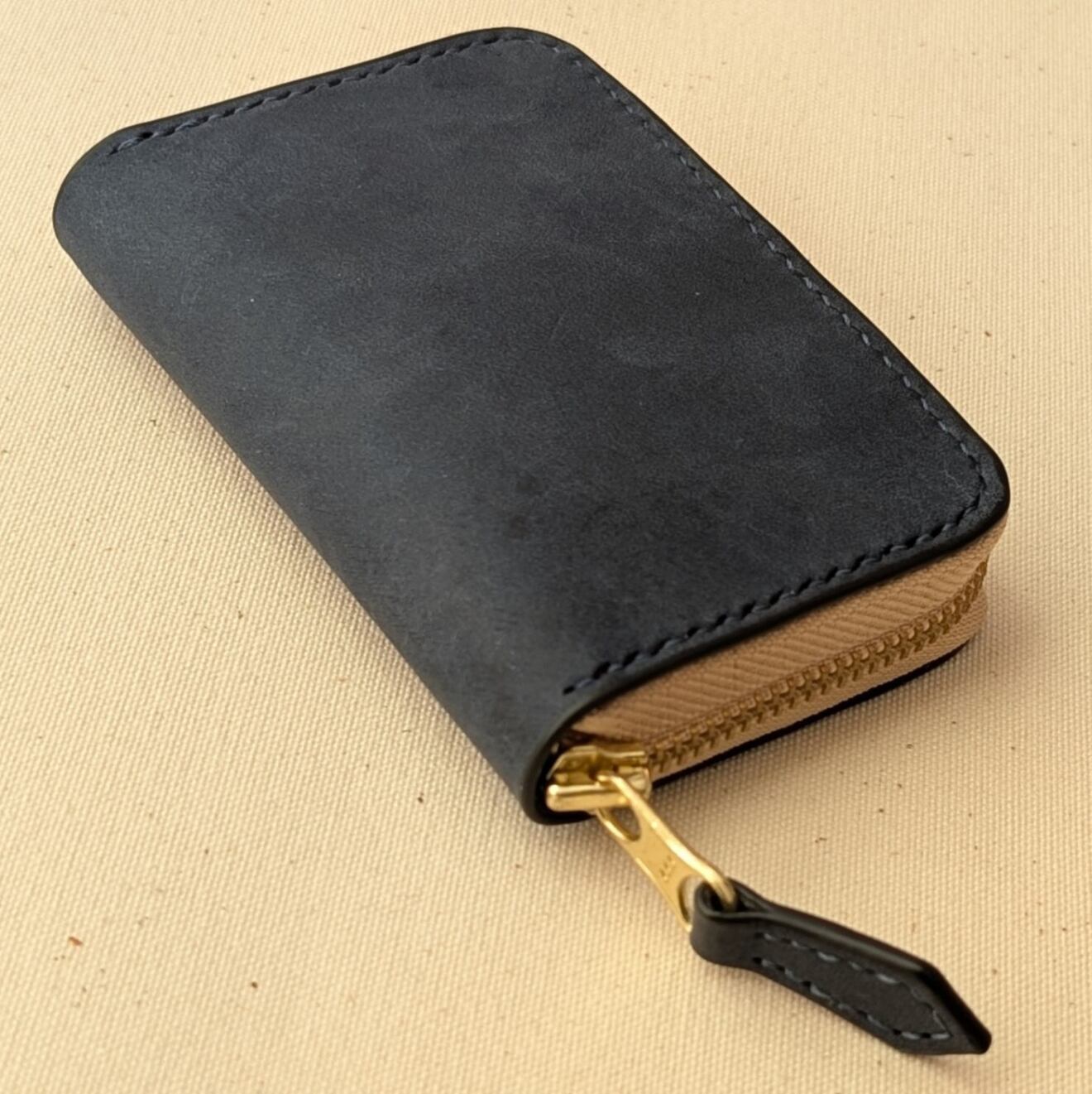 すべて手縫いで仕立てたカードケース(小銭も入ります)です。