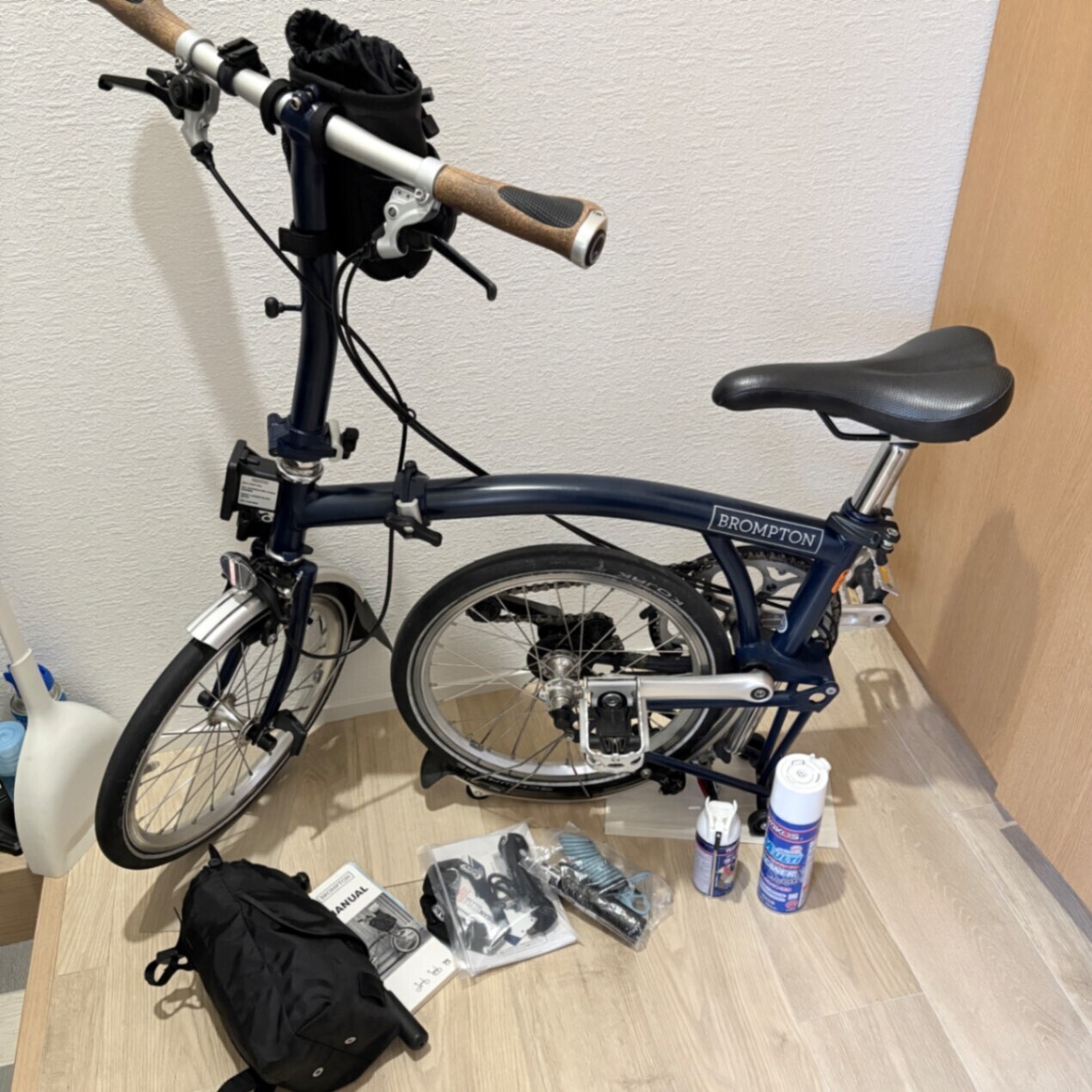 ブロンプトンS2L 2020年購入 テンペストブルー ライト、ポーチ、鍵、清掃用品、輪行バッグ