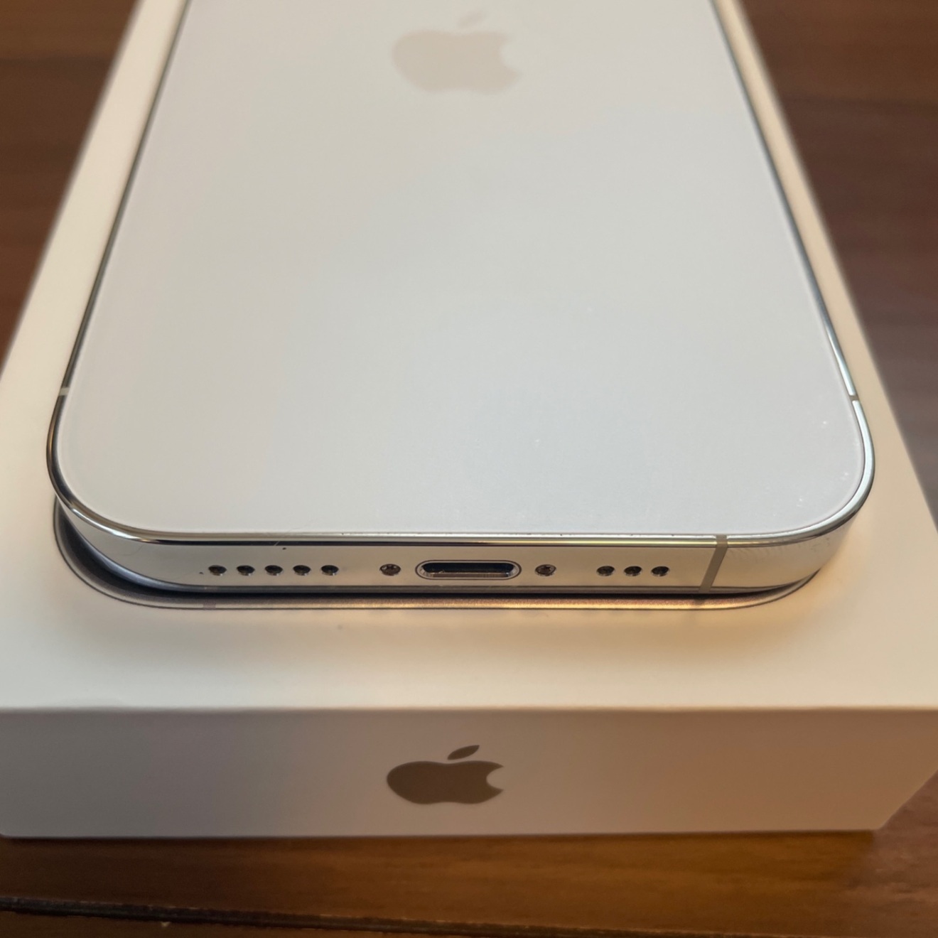 シルバーのiPhone 14 Pro、6.1インチディスプレイ、Lightningポート搭載。